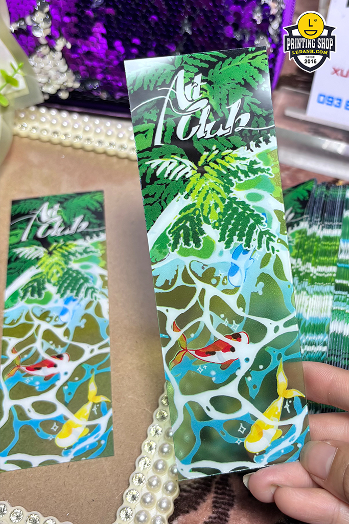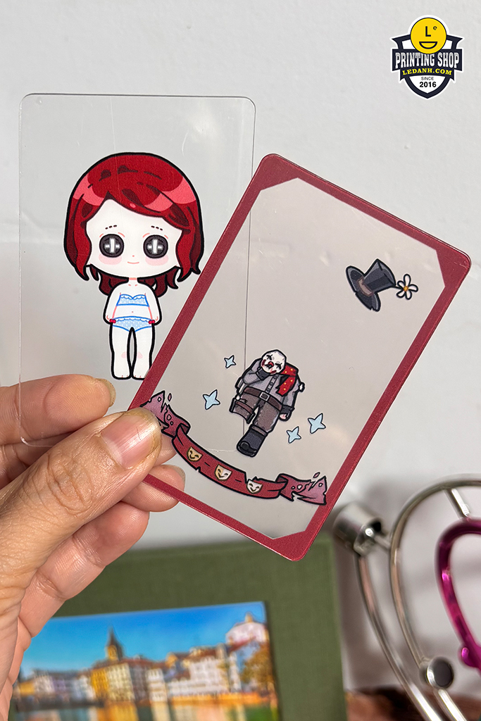 Qui cách : Size : 55X85mm, Nhựa PVC TRONG, in 1 mặt, Cắt Thành Phẩm, Bo Góc.