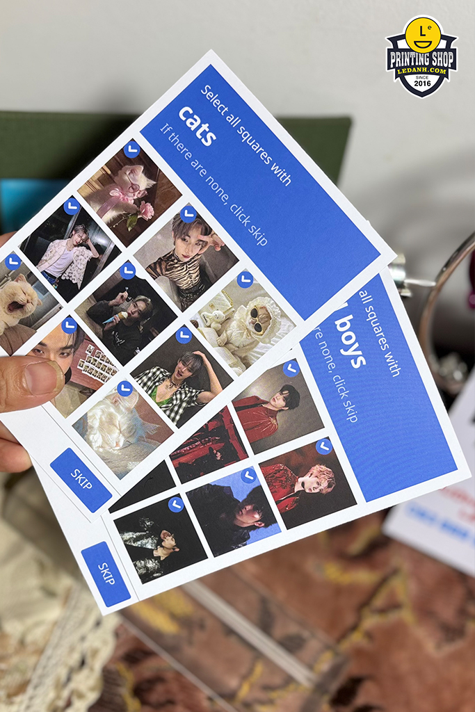 Qui cách : Size : 60x90mm / 70X90MM, Giấy C300gsm, in 1 mặt, Cán Màng 2 Mặt, Cắt Thành Phẩm